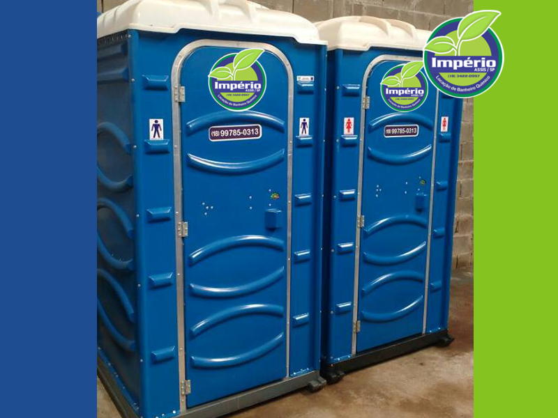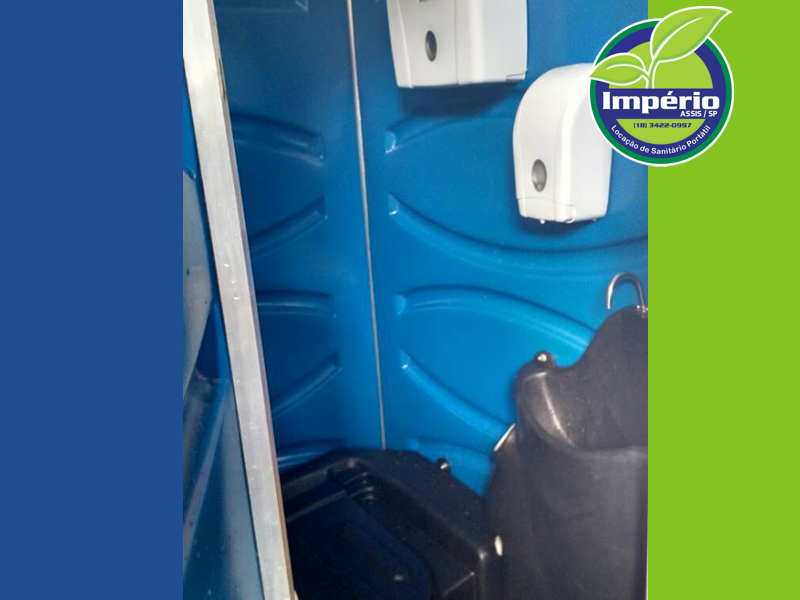 Banheiro Químico Luxo dotados de pia e descarga com acionamento no pé e suportes para sabonete, papel higiênico e papel toalha.